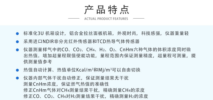 采用自主知識產(chǎn)權的NDIR非分光紅外技術,主要用于測量氣體中的CO、CO2、CH4、C3H8、SO2、NO等氣體的體積濃度及熱值。全進口傳感器、測量精度高、結構簡單、維護方便,軟件功能強大,可拓展性強、現(xiàn)場實用性好,目前暢銷國內(nèi)外。